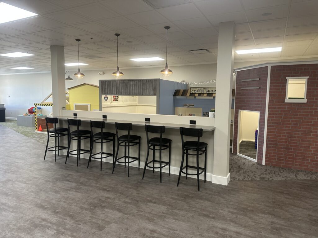 Our play cafe is designed for children learning to walk through age 8. We offer a corner for early crawlers, one-of-a-kind houses for creative play, a climbing structure with slides, and STEM activities for exploration and education.